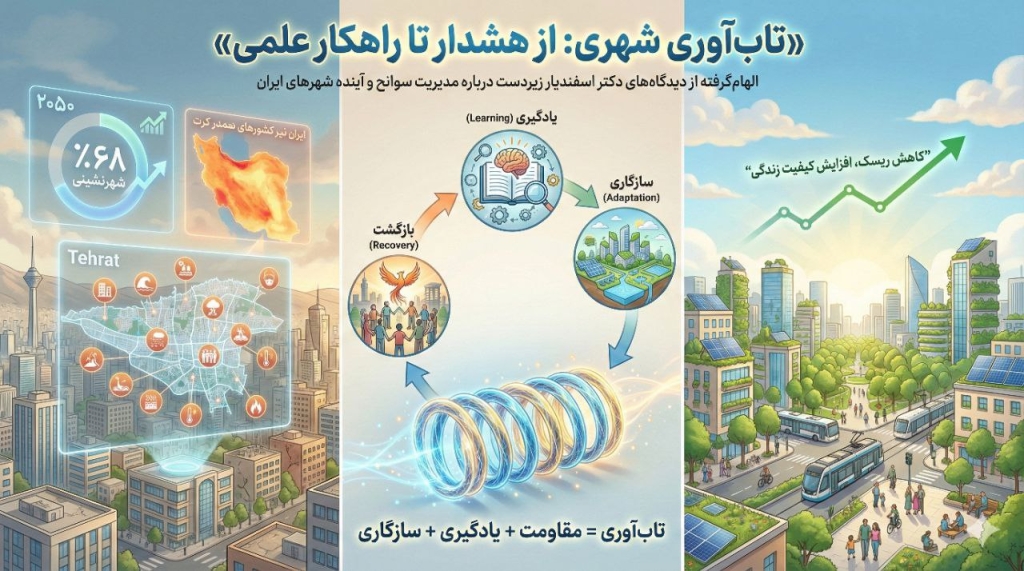 اسفندیار زبردست در پایان سخنرانی خود یادآور شد : تابآوری ، نه محصول یک پروژه ، بلکه فرایند یادگیری و سازگاری دائمی شهر با جهان در حال تغییر است . شهری تابآور است که از دل هر بحران، فهم تازهای از بقا و آینده بیاموزد .