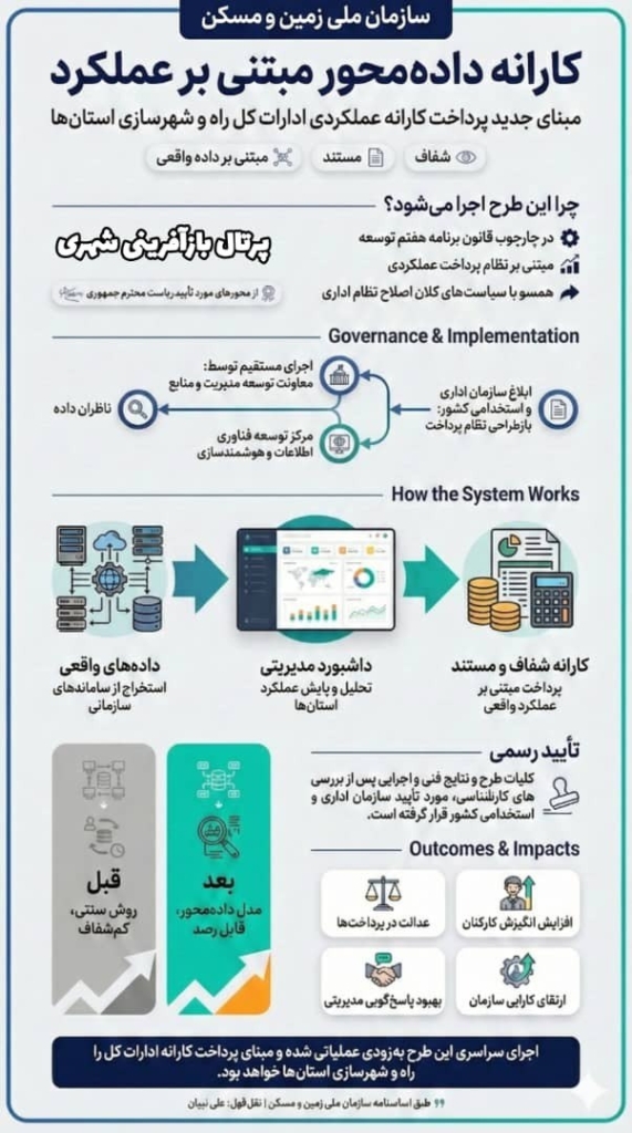 علی نبیان معاون وزیر و مدیرعامل سازمان ملی زمین و مسکن از استقرار طرح کارانه دادهمحور مبتنی بر عملکرد در جلسه شورای مدیران خبر داد و این طرح را گامی مهم در راستای استقرار حکمرانی دادهمحور ، شفافیت در پرداختها و ارتقای بهرهوری در ادارات کل راه و شهرسازی استانها عنوان کرد .